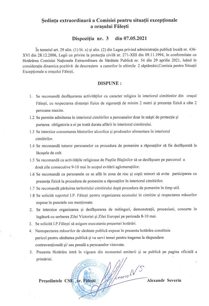 Dispoziția nr.3 din 07.05.2021 a Comisiei pentru situații excepționale a orașului Fălești